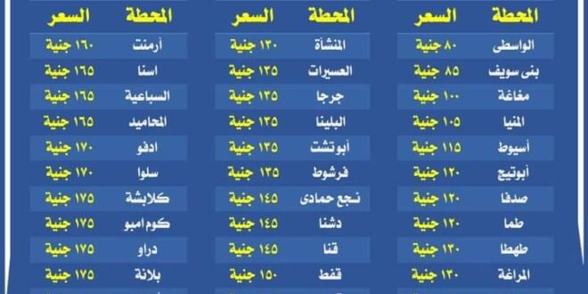 نشر الموقع الرسمي لوزارة النقل على شبكة التواصل الاجتماعي فيسبوك قائمة أسعار تذاكر السفر من الإسكندرية إلى مدن الصعيد.
