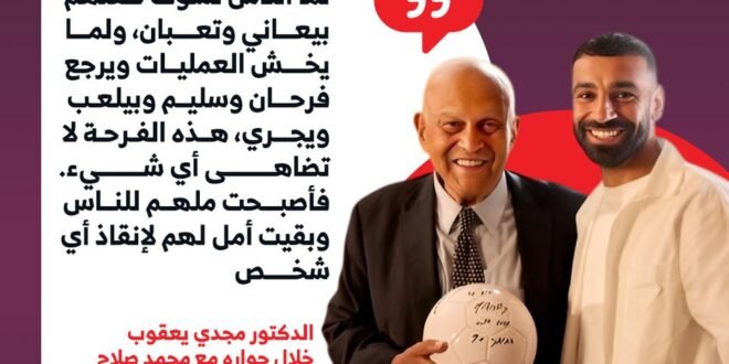في لقاء إنساني مليء بالمشاعر بين العالم الكبير الدكتور مجدي يعقوب والنجم محمد صلاح، تحدث الجراح العالمي عن رسالته الإنسانية التي يعمل من أجلها منذ عقود. وقال إن كل طفل يشفى من معاناة مرضية يعتبره انتصارًا شخصيًا لا يُقارن بأي إنجاز آخر، مؤكدًا أن عمله في مجال جراحات القلب يُعد رحلة ممتدة هدفها تخفيف الألم عن الأطفال.