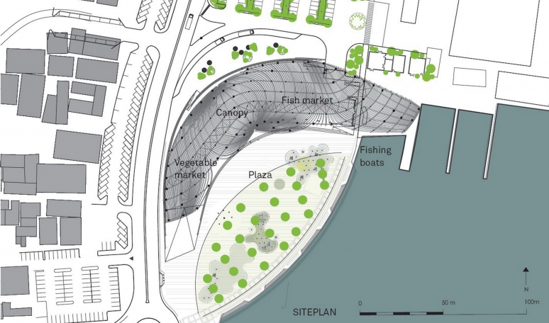 على التقاليد وضرورة البحث عن الابتكار، تم تصميم سوق مطرح للأسماك على مساحة